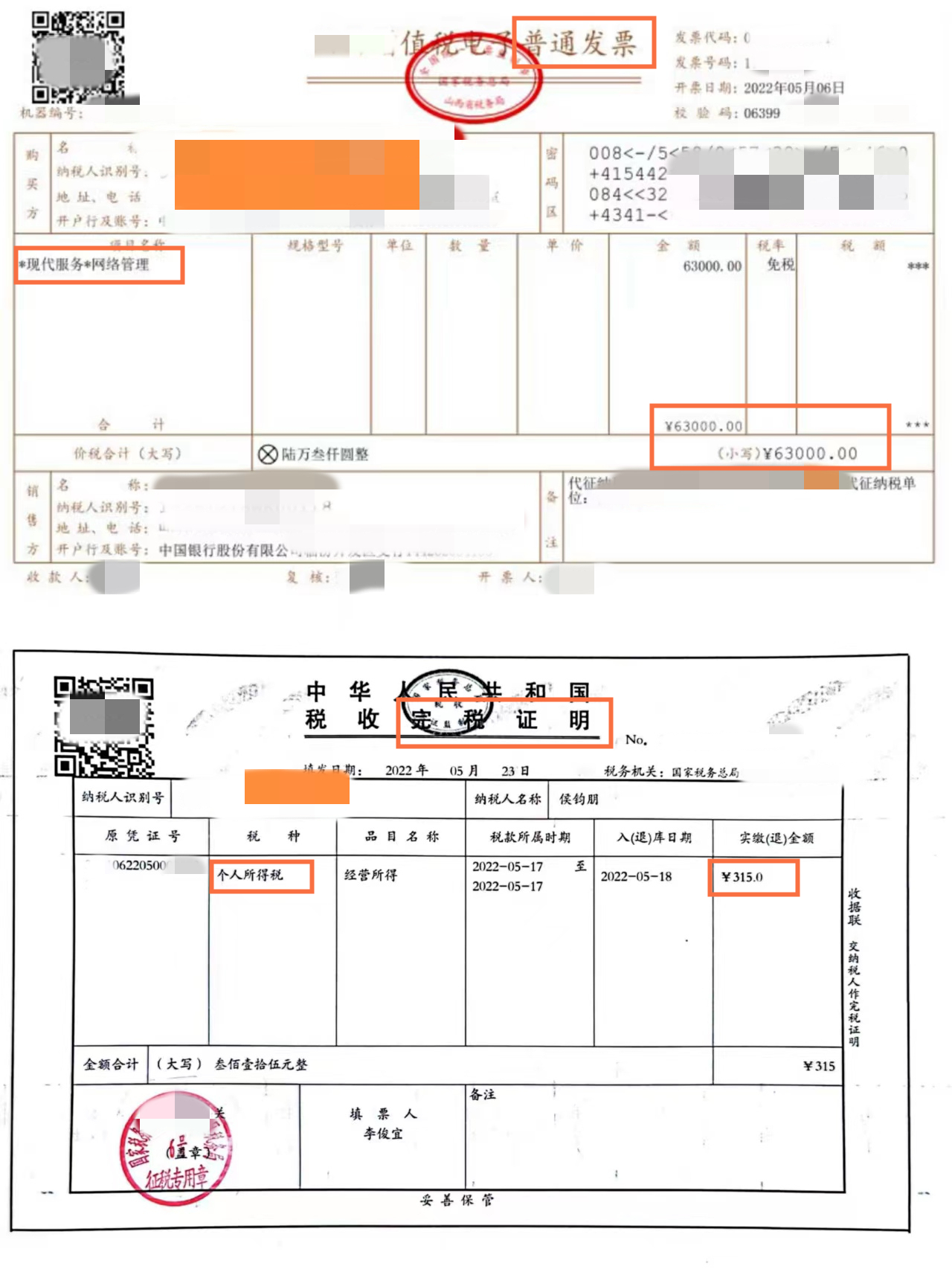 平臺(tái)給企業(yè)開(kāi)具的樣票和申報(bào)后的個(gè)人完稅憑證