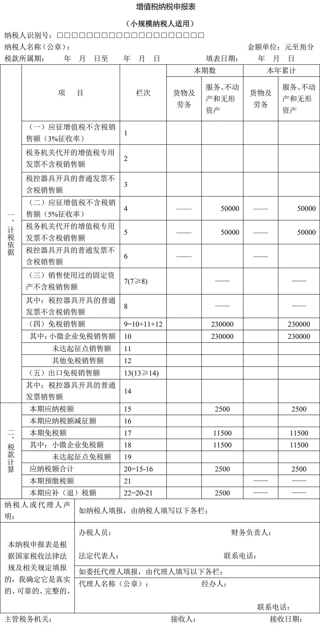1、開具增值稅專用發(fā)票部分,填列主表 “服務(wù)、不動產(chǎn)和無形資產(chǎn)”列第4欄、第5欄填寫5萬元,第15欄、第20欄填寫0.25萬(=5萬×5%)。