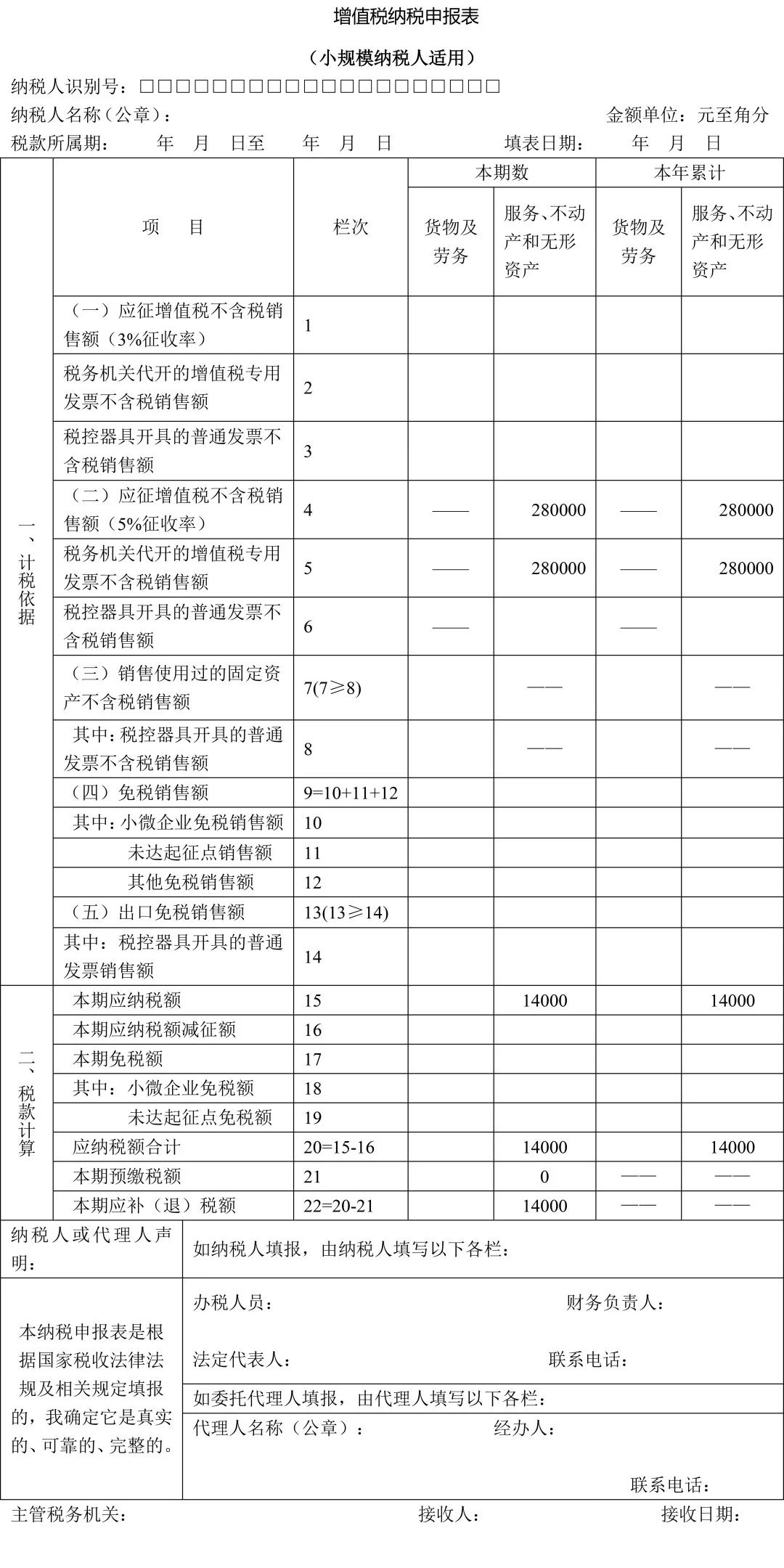 2、“服務(wù)、不動產(chǎn)和無形資產(chǎn)”列第9欄、第10欄的填寫28萬,第17欄、第18欄填寫1.4萬(=28萬×5%)。